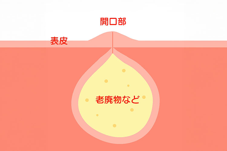 触るとしこりのように感じ、中央に小さな開口部が見えることがあります。