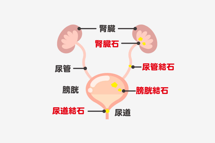 腎臓や尿管、膀胱などに結石がみられる疾患ですが、結石が腎臓内にとどまっているときは目立った症状がみられないことも多いです。