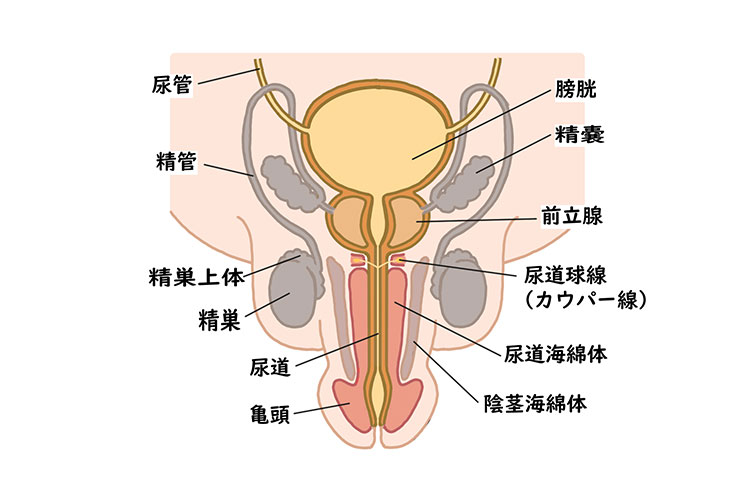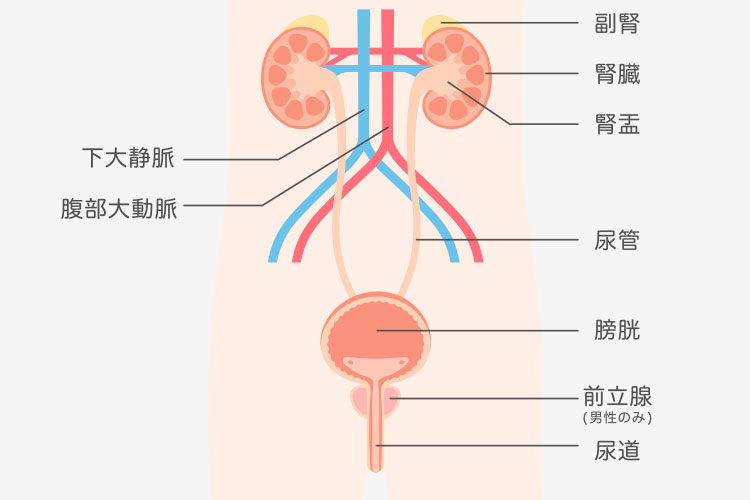 本ページでは、副腎から尿道までの位置関係を示した「腎・尿路の解剖図」と、男性生殖器(陰茎・精巣)のイラストを用いながら、泌尿器科で扱う疾患や検査についてわかりやすく説明します。
